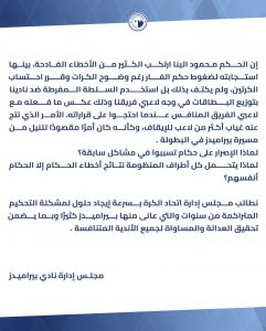نطالب مجلس إدارة اتحاد الكرة بسرعة إيجاد حلول لمشكلة التحكيم المتراكمة من سنوات والتي عانى منها بيراميدز كثيرا وبما يضمن تحقيق العدالة والمساواة لجميع الأندية المتنافسة.