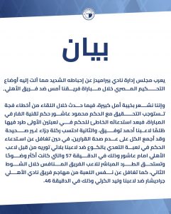 أصدر مجلس إدارة نادي بيراميدز بيانا رسميا بشأن أحداث مباراة الفريق أمام الأهلي في الدوري، وما شهدته من أخطاء تحكيمية فجة في حق الفريق ما تسبب معه في خسارة نقطتين هامتين في مشوار الدوري، وفقدان عدد من لاعبيه في المباريات المقبلة للإيقاف بسبب قرارات الحكم، وحكام تقنية الفيديو.