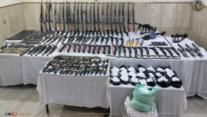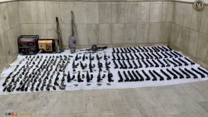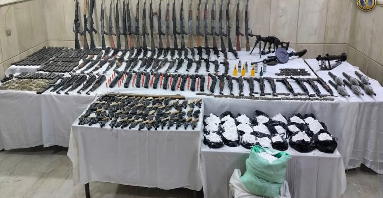 فقد تمكن خبراء المفرقعات التابعين للوزارة من تفكيك عدد من العبوات البدائية التى كانت مزروعة بمحيط أسوار المبنى محل إختبائهم من الداخل للحيلولة دون إقتحامه ، كما تم ضبط مخزن الأسلحة الخاص بالبؤرة الإجرامية والذى يحتوى على عدد ( ٢٠١ ) قطعة سلاح ليصل إجمالى الأسلحة المضبوطة ( ٣٥٩ ) قطعة سلاح عبارة عن ( أر بى جى – ٨ قنابل F1 – ٣ رشاش جرينوف – ٨٨ بندقية آلية – ٧١ بندقية خرطوش – رشاش متعدد – ١٨٧ فرد محلى – كمية كبيرة من الذخائر المتنوعة) تم إتخاذ الإجراءات القانونية .