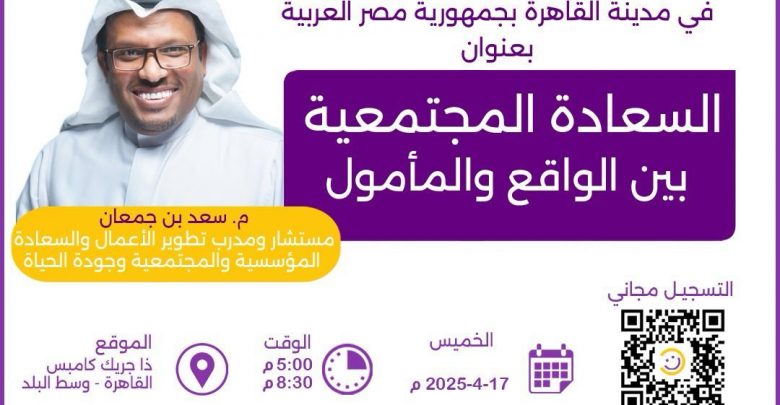 تنطلق في القاهرة غدا الخميس الموافق 17 أبريل 2025 سلسلة أمسيات السعادة للمدرب السعودي المهندس سعد بن جمعان، وتعقد الأمسية الأولي في الحرم اليوناني بالجامعة الأمريكية، تحت عنوان “السعادة المجتمعية بين الواقع والمأمول”.